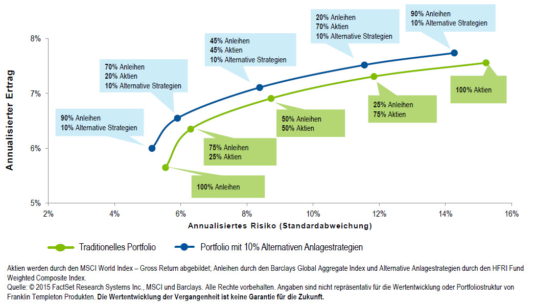 Ob nun ein Portfolio überwiegend in Anleihen (konservativ) oder in Aktien (aggressiv) investiert ist, die Beimischung von Alternativen Anlagestrategien kann einen wesentlichen Beitrag zur Effizienz eines Portfolios leisten. Der Blick auf die unten stehende Grafik verdeutlicht: Eine Allokation auf Alternative Anlagestrategien hätte das Ertragspotenzial steigern können, ohne die Risiken wesentlich zu erhöhen.