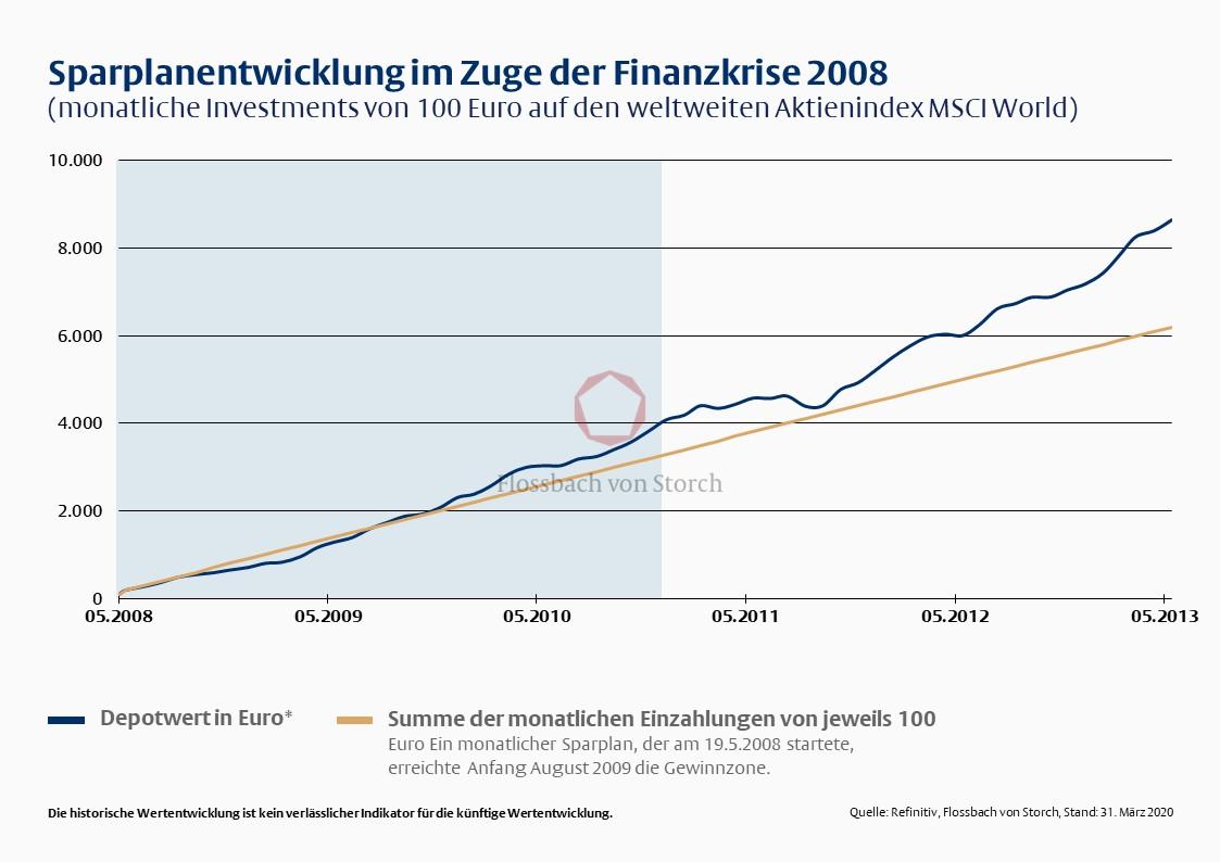 Für Sparplananleger hat es sich in der Finanzkrise ausgezahlt, konsequent an ihren regelmäßigen Zahlungen festzuhalten, auch wenn sie damit bis Juli 2009 im Minus lagen. Wer in Aktien investiert, braucht grundsätzlich Zeit, mindestens fünf, besser zehn oder zwanzig Jahre. Eine kurzfristige Anlage in Aktien ist Spekulation, also eine Wette, die wenig mit einem soliden Vermögensaufbau zu tun hat.