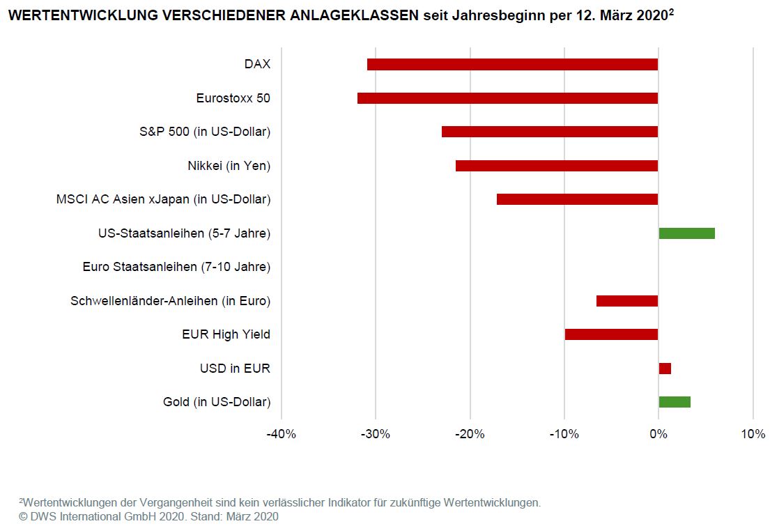 Bei aller Sorge um die Gesundheit sollten wir aber die Kapitalmärkte nicht aus den Augen verlieren. Diese haben sich durch das Übergreifen des Virus von China auf Europa und die USA in einer bisher nicht dagewesenen Geschwindigkeit nach unten entwickelt. Der deutsche Aktienindex DAX, stellvertretend für viele wichtige Indizes, ist seit seinem Allzeithoch am 20. Februar 2020 erheblich eingebrochen. Allein in dieser Woche verzeichnete der Index einen Großteil der Verluste. Gleich zweimal stürzte der Index zur Eröffnung deutlich ab. In den USA wurde der Handel aufgrund der Kursverluste zur Eröffnung jeweils ausgesetzt.