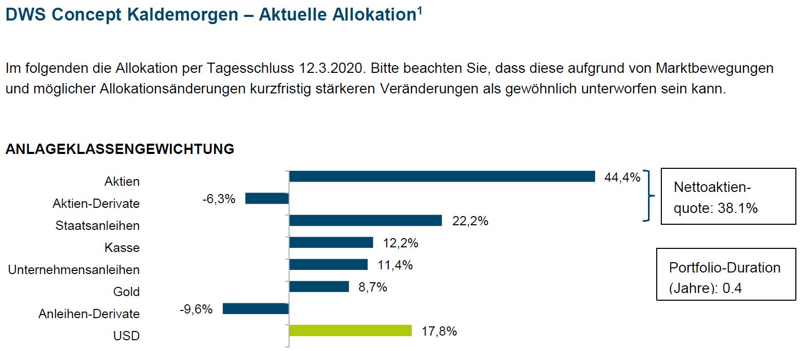 Im Falle des DWS Concept Kaldemorgen stellt sich konkret die Frage, ob durch umfangreiche Verkäufe von Aktien auf einem aus unserer Sicht irrational niedrigen Niveau das Risikoziel eingehalten werden soll. Wir sind der Meinung, dass die gegenwärtige Schwäche an den Aktienmärkten möglicherweise temporärer Natur ist. Bei einem Abebben der Infektionsraten könnte der Aktienmarkt ein deutliches Aufwärtspotential besitzen. Auf keinen Fall ist die Situation mit der systemischen Krise der Märkte, ausgelöst durch die Finanzkrise 2008, zu vergleichen. Auch wenn es zu einem deutlichen Rückgang der Wirtschaftsaktivität kommt, bis hin zu einer Rezession, so könnte dies eine zeitlich begrenzte Entwicklung sein. Die Produktionskapazitäten werden durch den Virus nicht zerstört, sondern nur vorübergehend weniger ausgelastet. Was bleiben könnte, ist vor allem in den USA ein Zinsniveau, das niedriger als vor der Krise ist. Dadurch gewinnen Aktien gegenüber Anleihen noch weiter an Attraktivität.