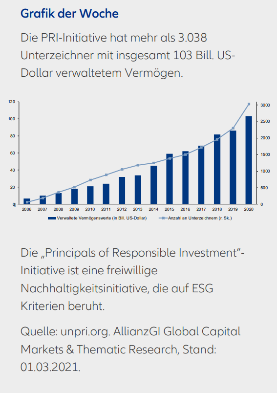 Gleich zu Anfang der abgelaufenen Woche erinnerte uns der Weltklimarat (das Intergovernmental Panel on Climate Change - IPCC) daran, dass die Erderwärmung schneller als befürchtet vonstattengeht. „Finance For Future“, also das gezielte Investieren gegen den Klimawandel wird damit noch wichtiger. Die ESG-Kriterien weisen den Weg (vgl. Grafik der Woche).