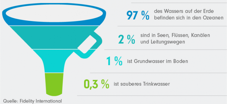 Trinkwasser ist eine endliche Ressource: Nur 3 von 1.000 Litern Wasser auf der Erde sind Trinkwasser. Um sauberes Wasser zu gewinnen, sind spezielle Methoden zur Aufbereitung und zum Transport nötig. Darin liegen bei steigender Nachfrage durch Haushalte, Industrie und Landwirtschaft große unternehmerische Ertragschancen.