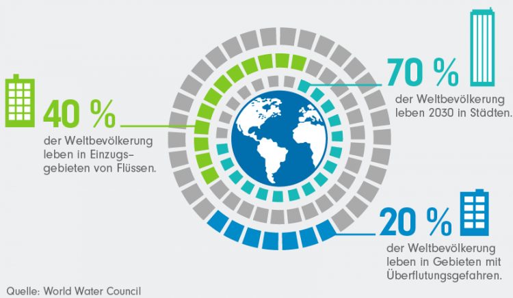 Damit steigt der Bedarf an einer Infrastruktur zur Wasserversorgung sprunghaft an, vor allem in Metropolen und Megacitys. Ver- und Entsorger können von milliardenschweren Investitionen profitieren. Die Stadtbevölkerung Chinas wächst jährlich um rund 20 Mio. Menschen. Das entspricht rund 20 Städten von der Größe Kölns.