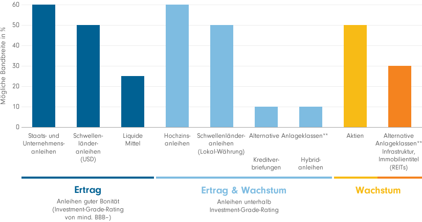 Regelmäßige Erträge geben Anlegern das gute Gefühl, dass ihr Kapital für sie arbeitet. Oder sie werden als stete Einkommensquelle genutzt. Wichtig ist den meisten Anlegern, dass die Erträge Hand in Hand gehen mit einem kontrollierten Risiko. Möglich wird diese Kombination durch eine aktive Management-Strategie und einen Anlagemix, der die Chancen verschiedener Anlageklassen vereint. Das Resultat: Eine gesunde Mischung nachhaltiger Erträge.